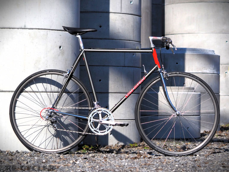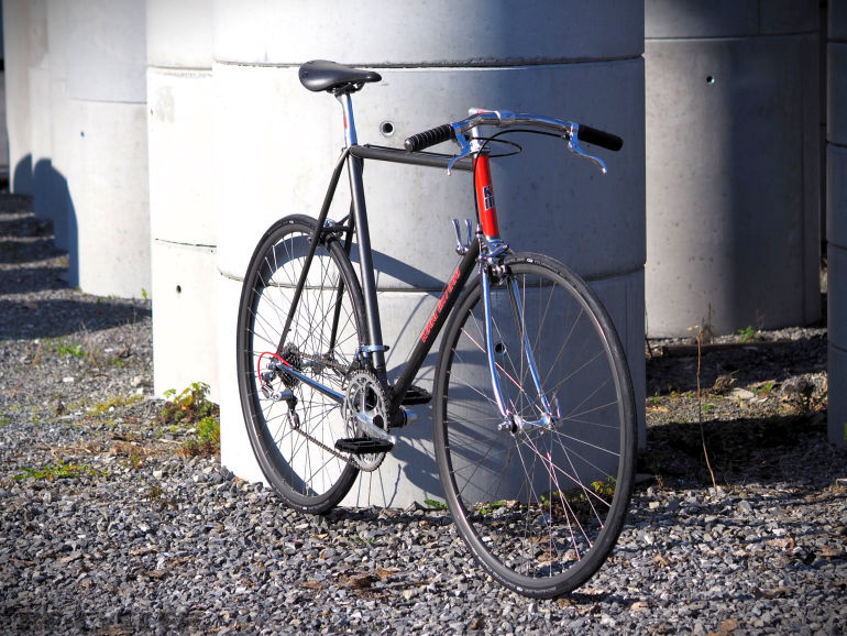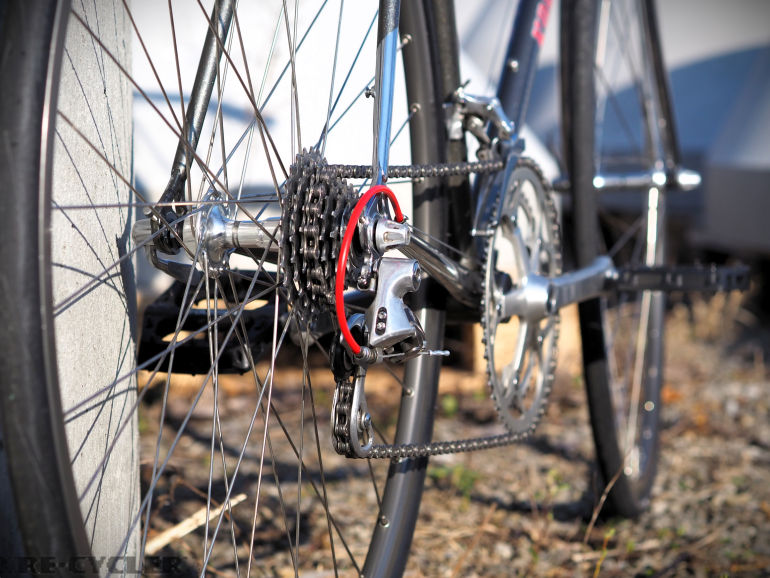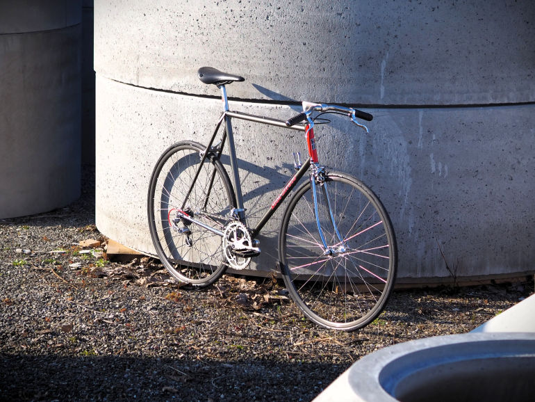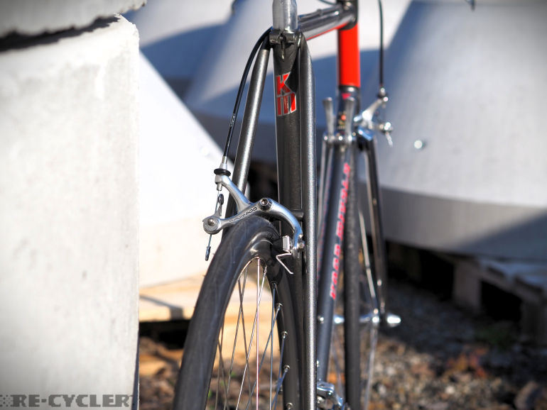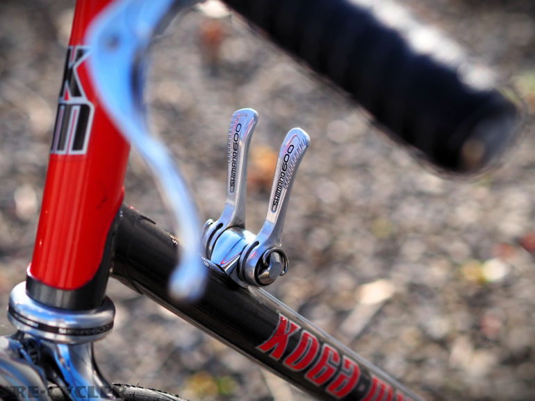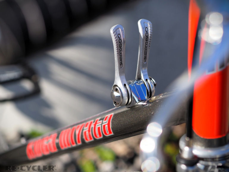 Der fast kompletten Shimano 600 ex Komponentensatz erstrahlt am anthrazit metallic Stahlrahmen.