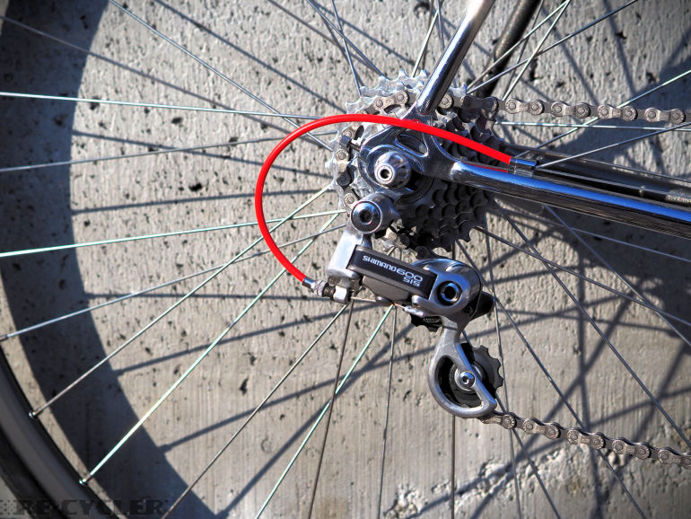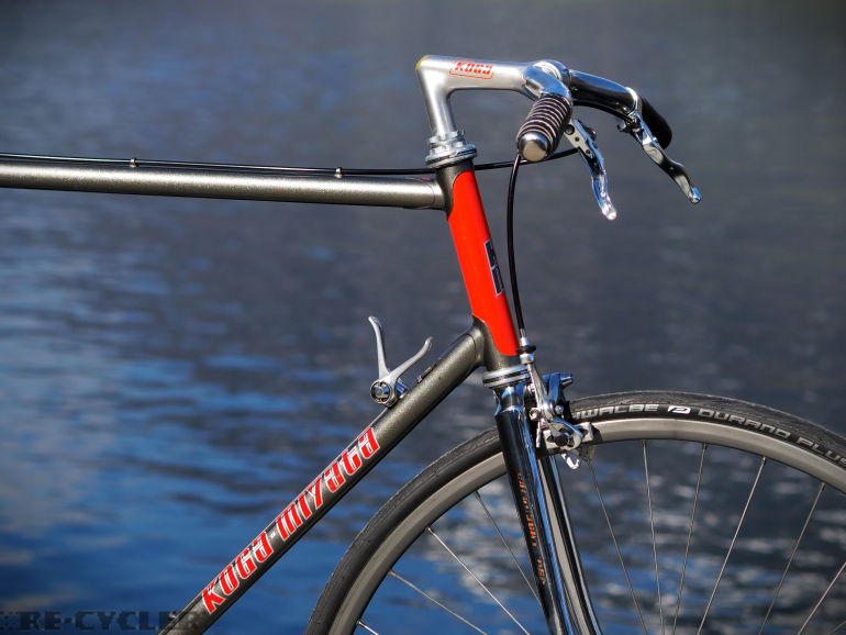 Die 2×7 Gänge schaltest du am Unterrohr mit den stilvoll angeordneten Hebeln, typisch für Koga-Miyata Rennräder. Der Shimano 600 RD-6208 Wechsler sieht wie neu aus und lenkt die Kette präzise auf der 7fach Kassette. Mit dem 50/42er Kranz vorne und dem 13-28 Ritzelpaket hinten fährst du sehr zügig. Bergauf ist auch einiges möglich.